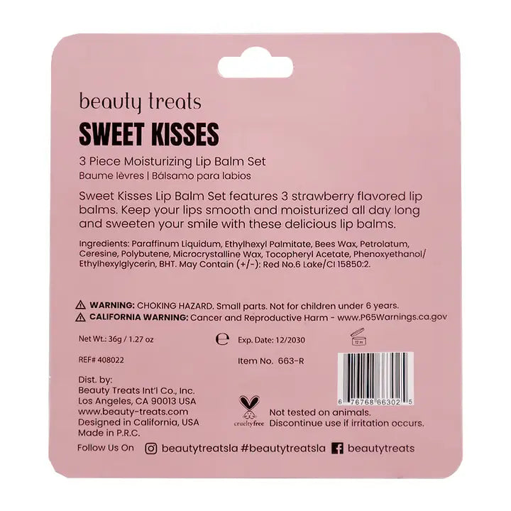 Sweet kisses lip balm set features 3 strawberry flavored lip balms. Keep lips smooth and moisturized all day long. 3 sets in a box.