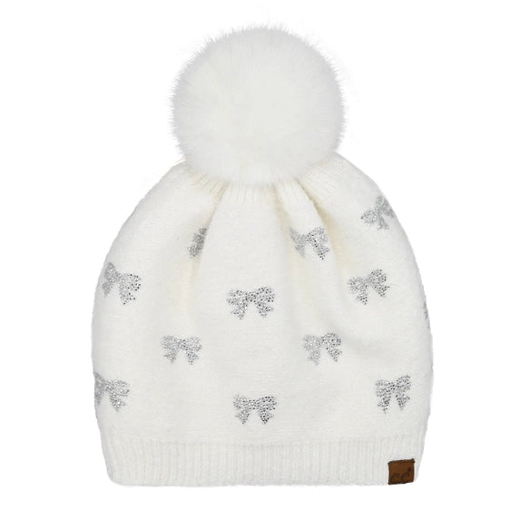 C.C Kids Allover Mini Rhinestone Bow Faux Fur Pom Beanie Ivory