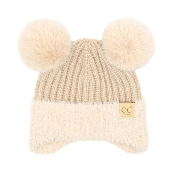 C.C Baby Fur Earflap Double Pom Beanie Beige