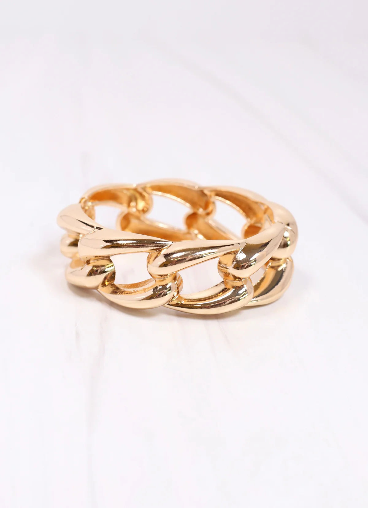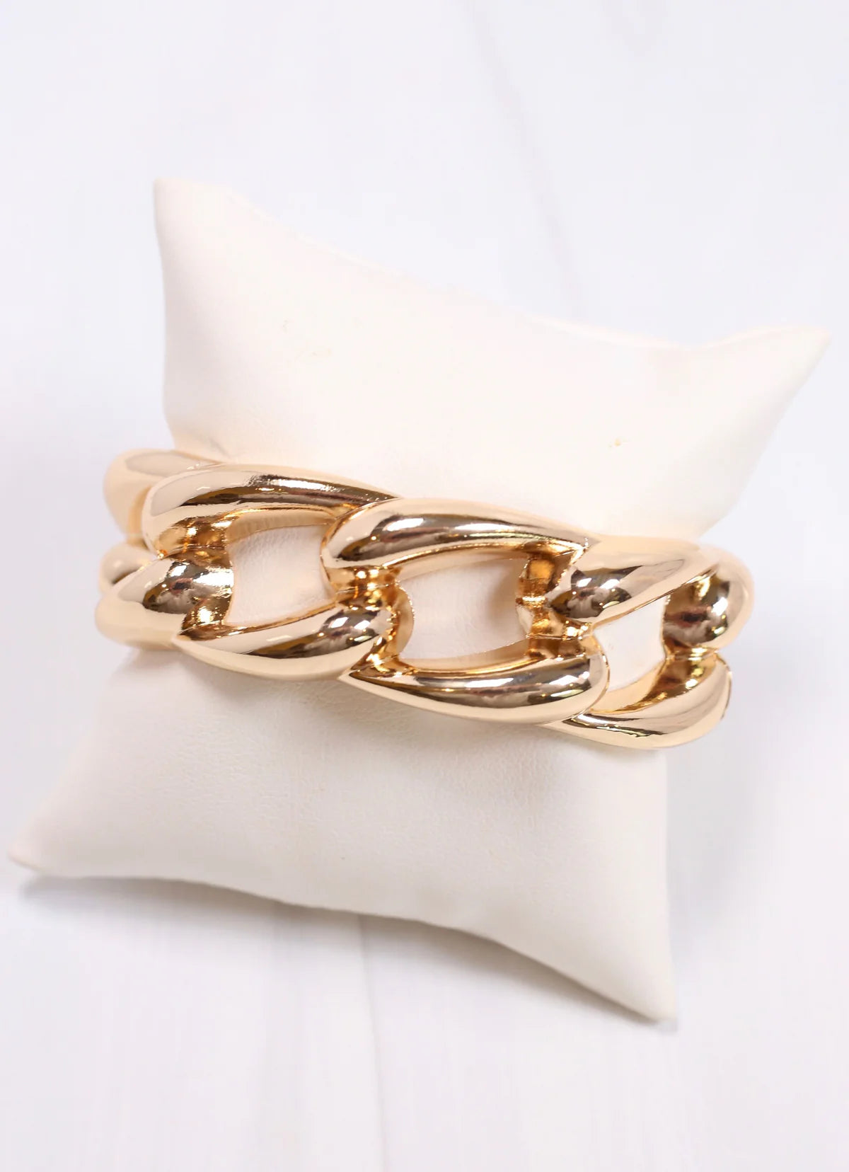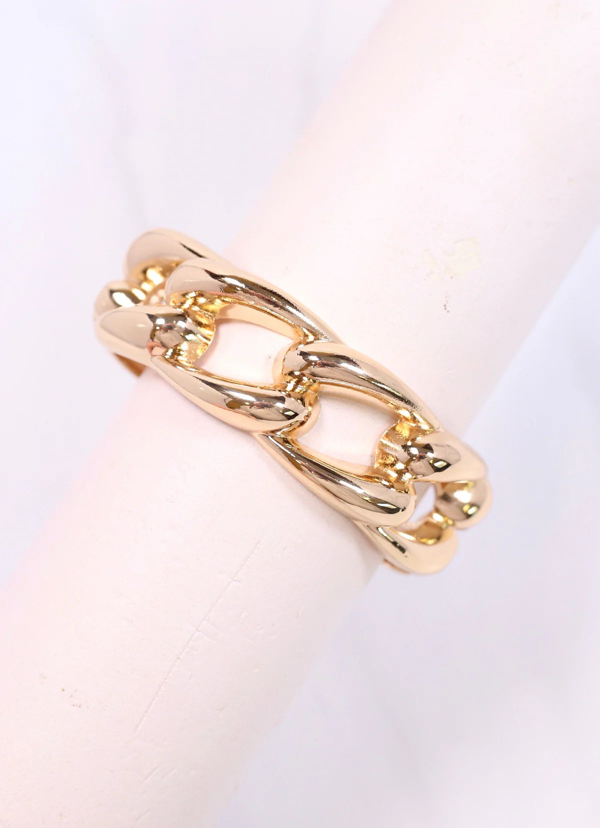 This shiny metal bracelet is made with large links and has a side hinge opening. It has a classic silhouette to pair well with any outfit.
