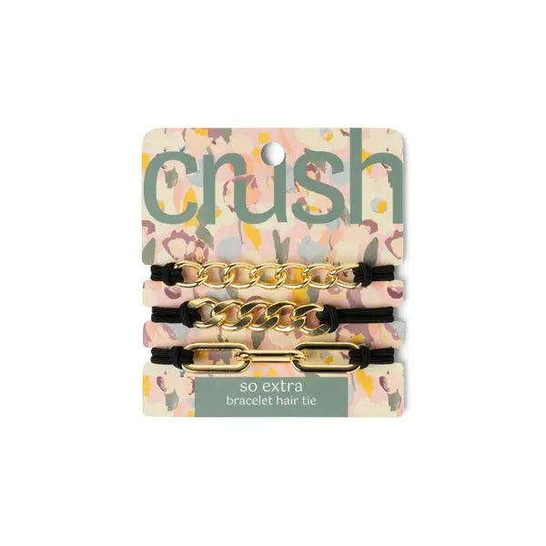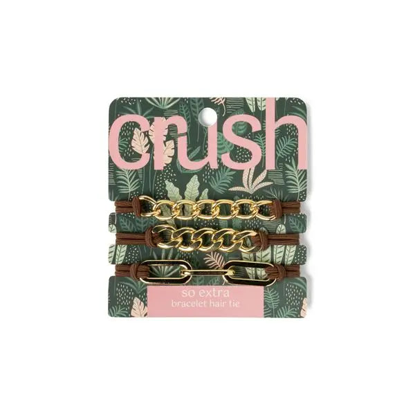 Designed for all the women that keep a hair tie handy on their wrist, these fashion-forward bands have goldtone chain accents that look super stylish in your hair, or worn as a bracelet when not in use. Cute, printed packaging makes this item a great gift and eye-catching impulse purchase!