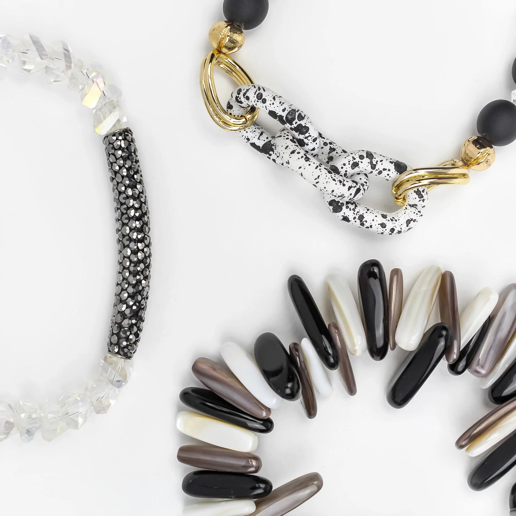 This stack is a perfect mix of beautiful black, white and gold colors! Featuring three bracelets, a speckled white and black chain link with gold accents, an eye catching black glitter bar, and alternating black, white and grey chip beads.