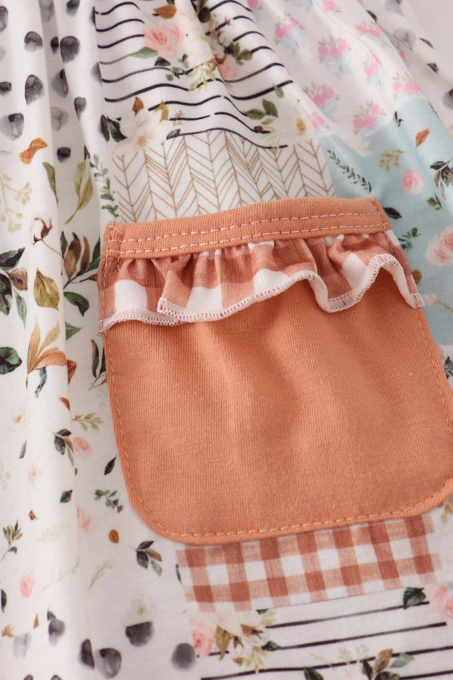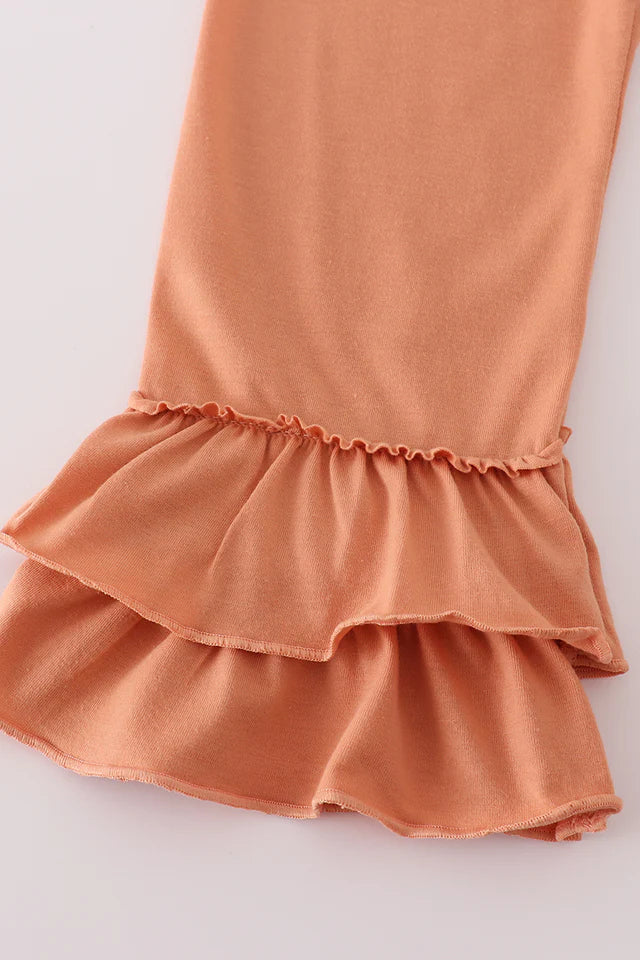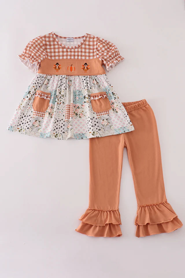 Celebrate the season in style with this playful fall set featuring charming turkey and pumpkin embroidery. The floral print adds a festive touch, while the ruffled pants bring a fun, flirty vibe. Perfect for cozy autumn days and festive gatherings, this outfit combines comfort with seasonal cheer.