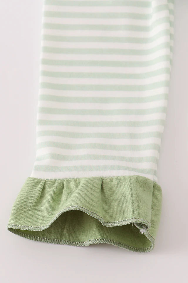This playful romper features charming sage stripes accented with a delightful turkey applique and ruffle details, perfect for adding a touch of whimsy to any little one's wardrobe. Comfortable and cute, it’s ideal for fun-filled days and special occasions alike.