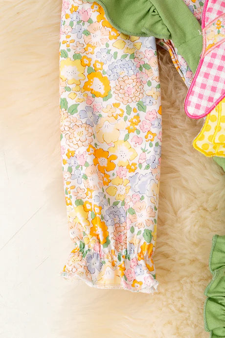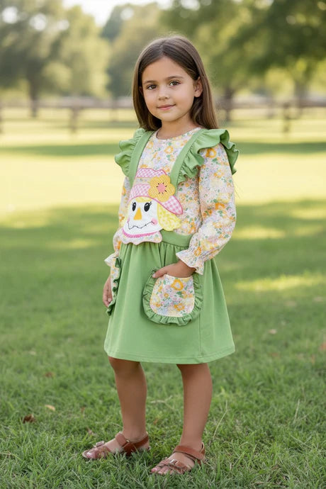 This scarecrow suspender dress combines comfort and style with its breathable 97% cotton and 3% spandex fabric, providing a flexible fit. Paired with a floral undershirt made from a soft blend of 95% polyester and 5% spandex, the outfit ensures ease of movement and durability. Perfect for playful days, this ensemble offers both charming design and practical wearability.