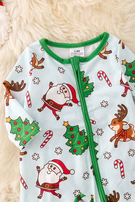 Introducing this exclusive baby onesie, featuring a festive Santa print and luxurious green trim. Made with a blend of high-quality polyester and spandex for a comfortable fit, this onesie also zips up for easy changing. Get your little one ready for the holidays with style and comfort.
