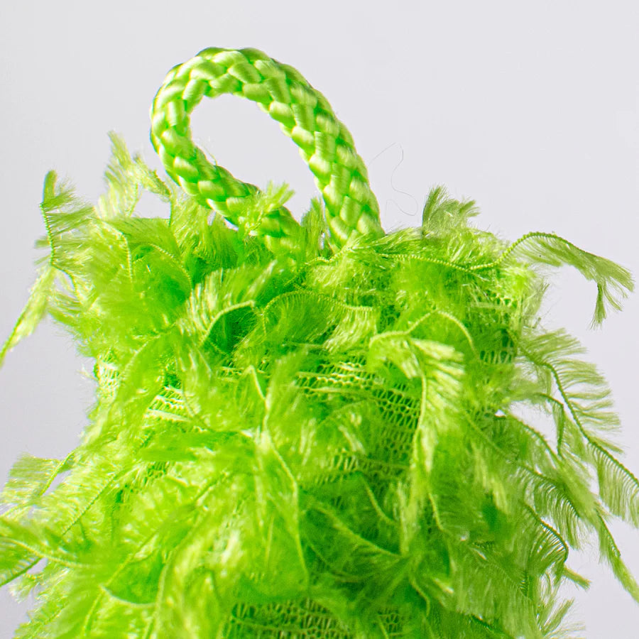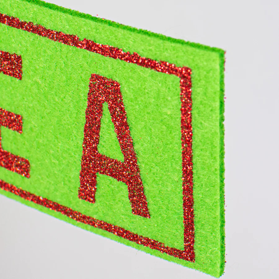 This set comes with four pieces - two plush Green Monster legs and two felt signs. The monster legs have lime green fur and wear red velvet, pointy shoes. The signs are constructed from stiffened felt and break up the phrase, "You're a mean one..." over two separate pieces. The message is written in red glitter and matches our "You're a Mean One Ribbon." The fur on the legs fits in our "Furry Series" of ribbon, ball spray, curly spray, and furry hand.