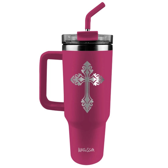 Kerusso 40 oz Stainless Steel Mug with Straw Filigree Cross Pink