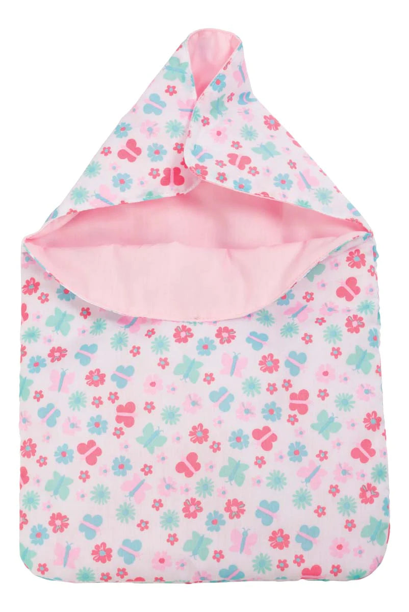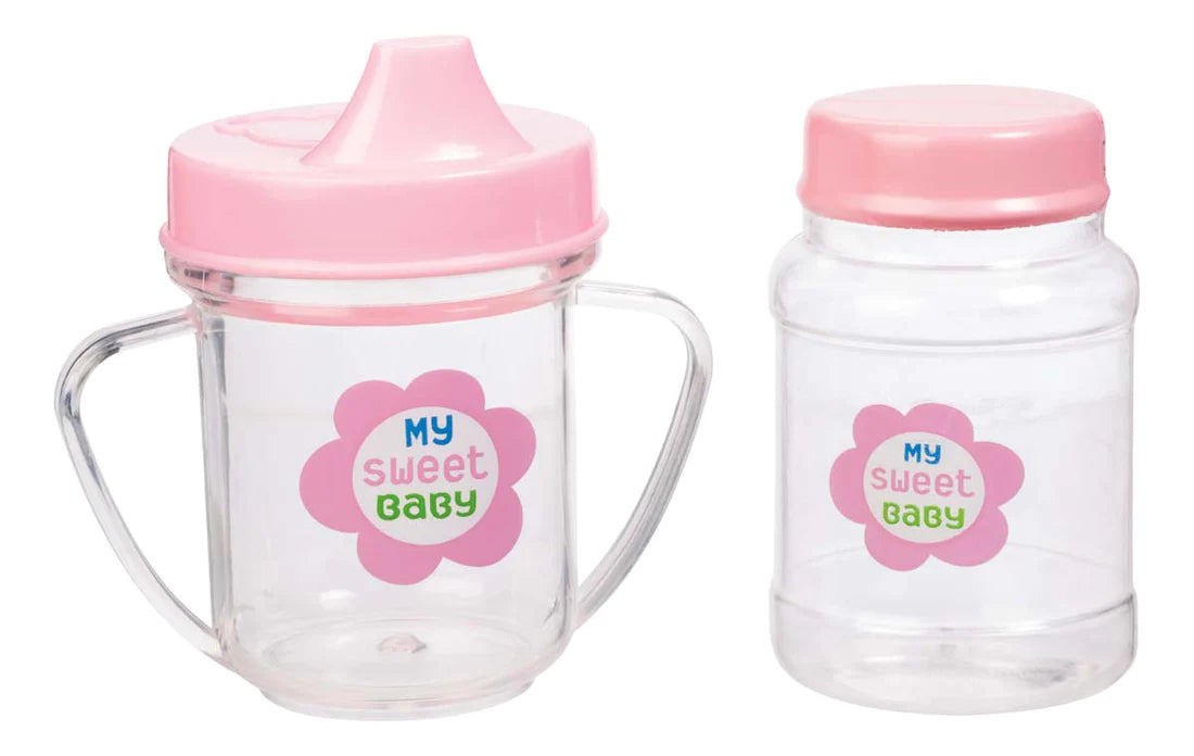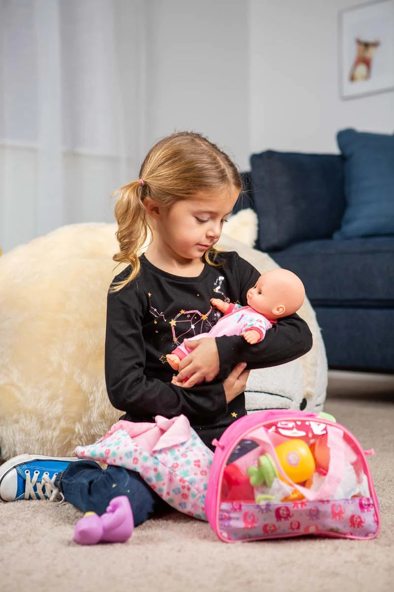 This 12-piece set includes an 11.50 inches soft body doll with vinyl head, extra outfit, baby food, bib, bottle, bowl and more. Packed in a reusable case with handle and zipper closure. Assorted fabric colors. 3yrs and up