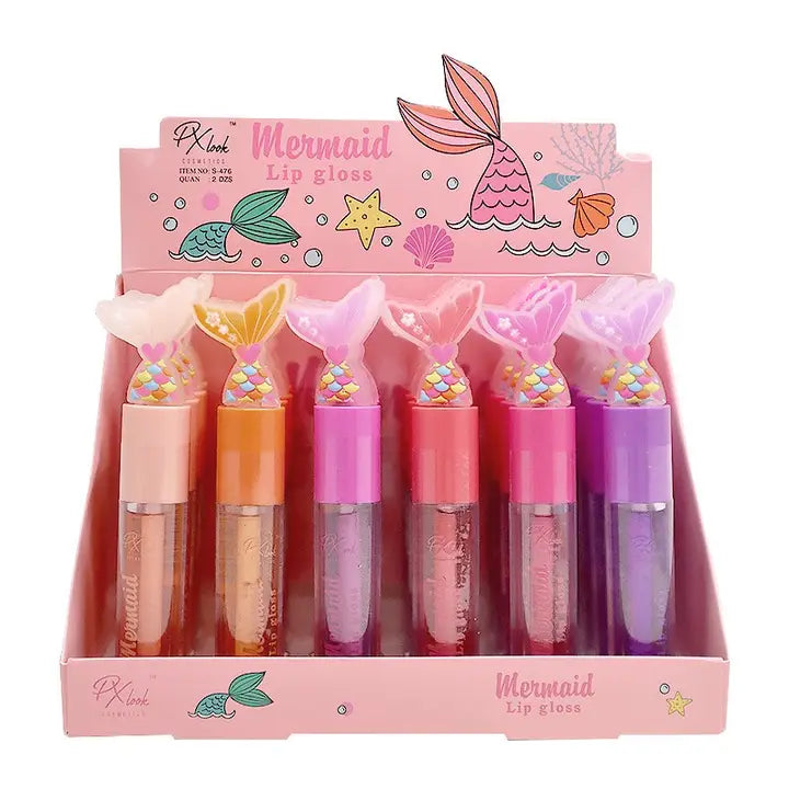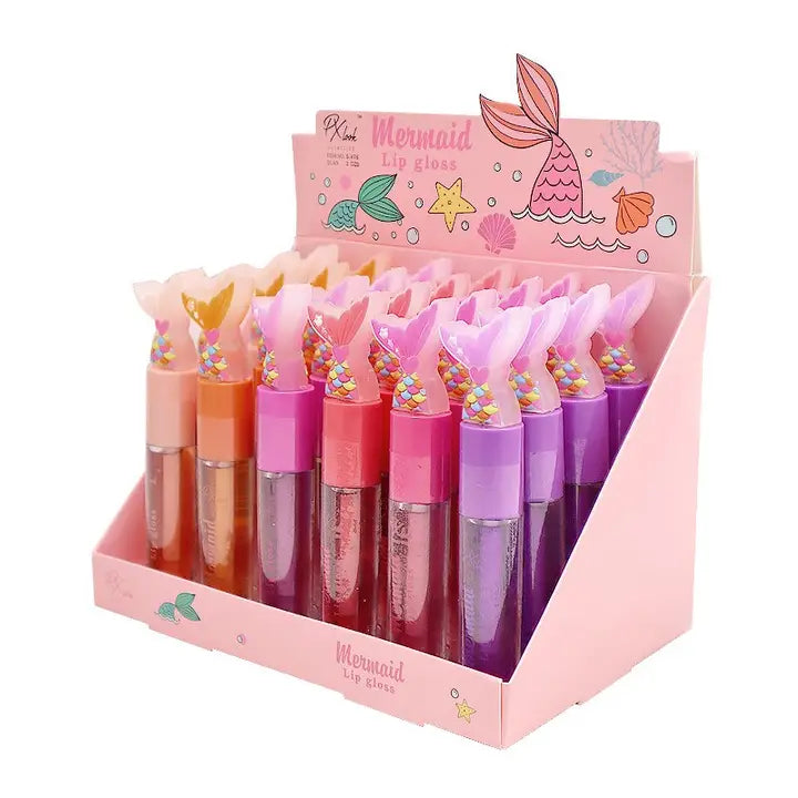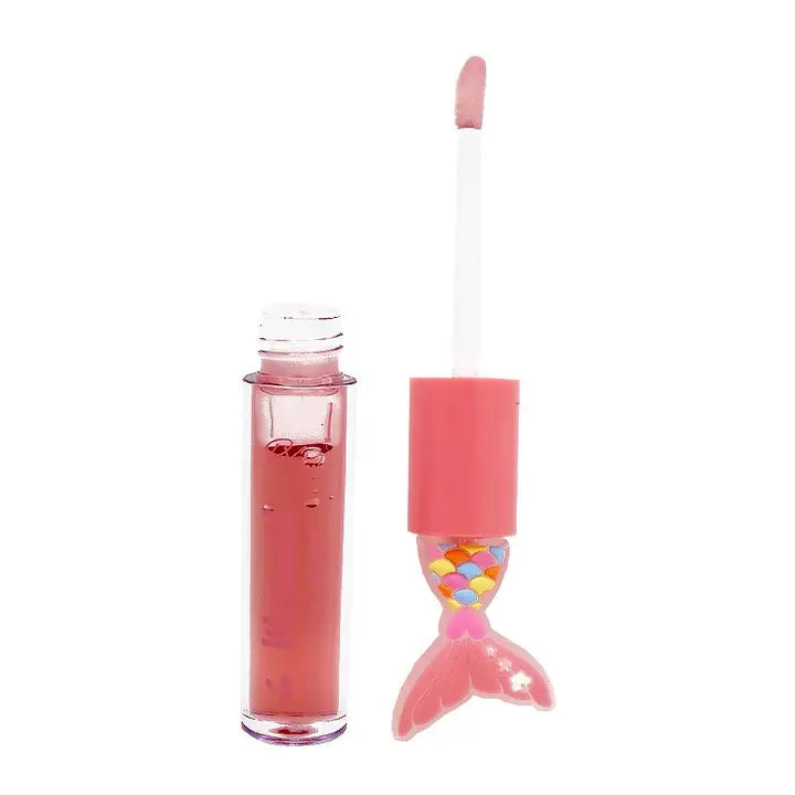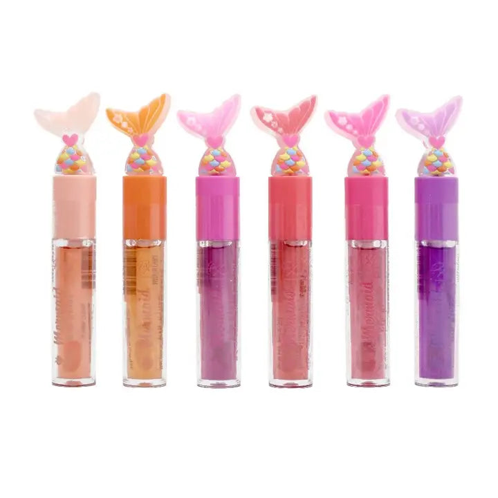 A high shine lip gloss with a glossy finish and a slight tint of color. Hydrating and moisturizing formula. Mermaid cap design. Assorted in 6 sweet scents. Peach, orange, cotton candy, cherry, strawberry, and grape.