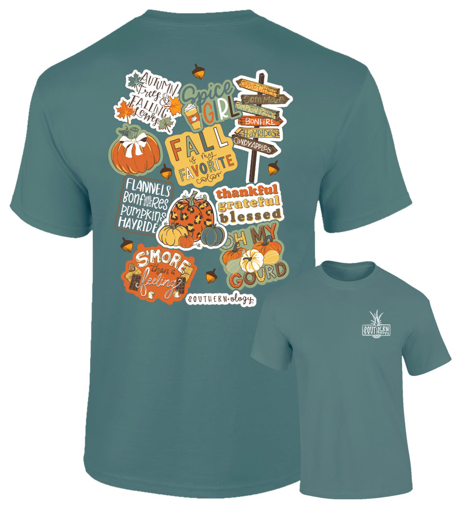 All your favorite fall things—on one tee! Our Southernology® Fall Decals design is a cozy collage of everything that makes autumn magical: pumpkins, lattes, falling leaves, and flannel vibes. It’s like a sticker book of the season, printed on a tee that you'll wear on repeat. Fun, festive, and full of fall charm, this shirt is perfect for everything from hayrides to harvest festivals. Printed on a Comfort Color blue spruce short sleeve tee.