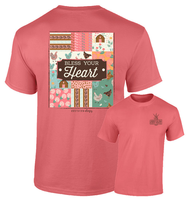 Classic Southern charm meets cozy vintage vibes in our Southernology® Patchwork Bless Your Heart tee. Featuring a beautifully stitched-look design with a quilt-inspired patchwork print. Printed on a Comfort Color watermelon short sleeve tee
