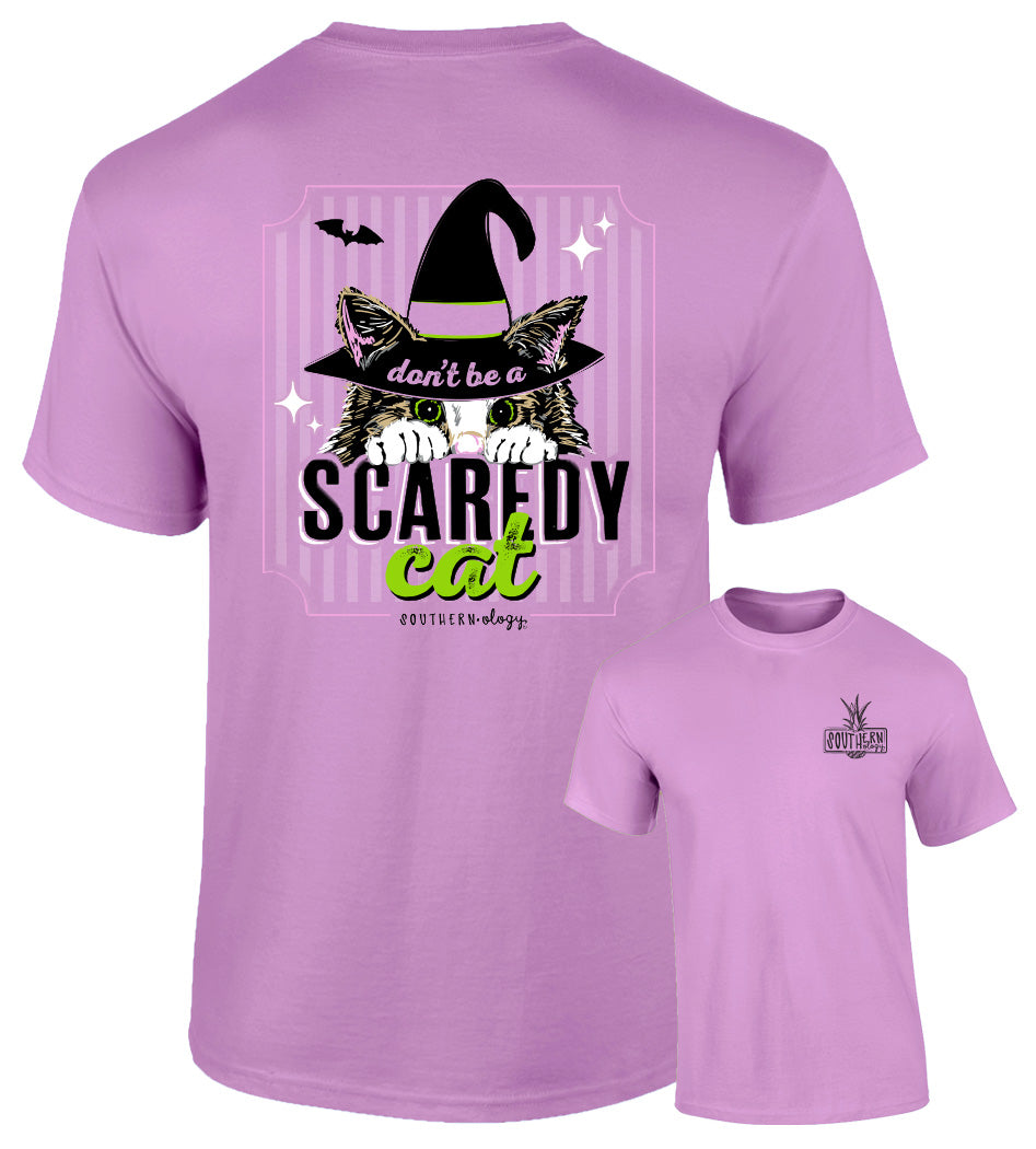 Get spooky with a side of sass! Our Southernology® Scaredy Cat tee is purr-fect for those who love Halloween but might just jump at every creak and shadow. Printed on a Comfort Color neon purple short sleeve tee.