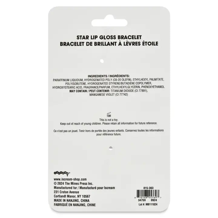 Introducing the Star Lip Gloss Bracelet - a trendy and playful accessory that combines fashion and function! This colorful bracelet features a center star charm that doubles as a vanilla scented lip gloss.