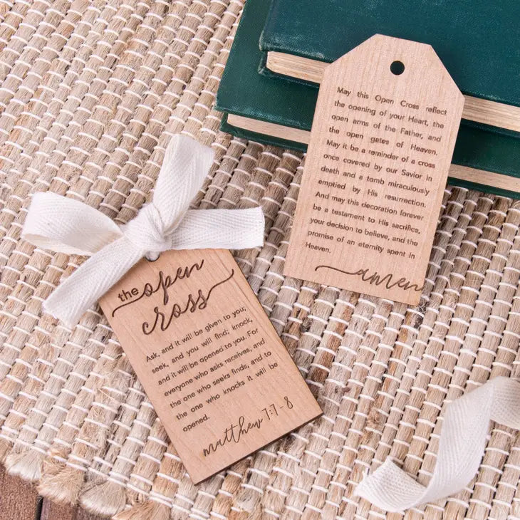 May this Open Cross reflect the opening of your Heart, the open arms of the Father, and the open gates of Heaven. May it be a reminder of a cross once covered by our Savior in death and a tomb miraculously emptied by His resurrection. And may this decoration forever be a testament to His sacrifice , your decision to believe, and the promise of an eternity spent in Heaven. Includes: open cross, ribbon, and 2-sided tag with sentiment and verse.