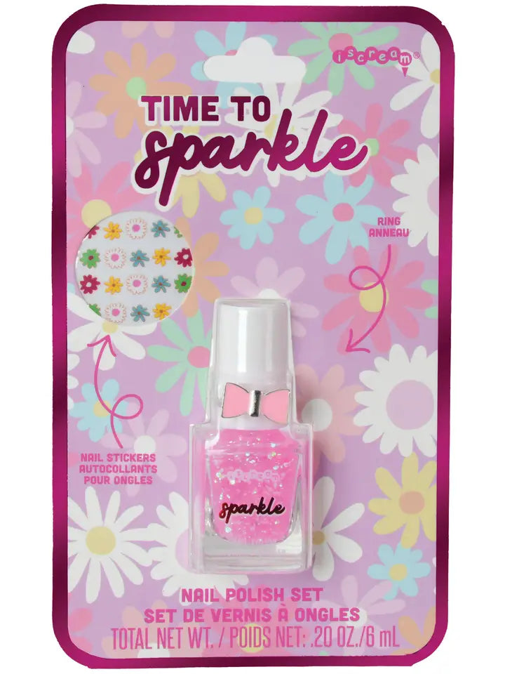 Add some sparkle to your nails and your outfit with our Time to Sparkle Nail Polish Ring Set! This set includes vibrant nail polish and fun nail stickers to create the perfect look. Plus, top off your style with a trendy ring included in the set. Get ready to shine and stand out with this must-have set!