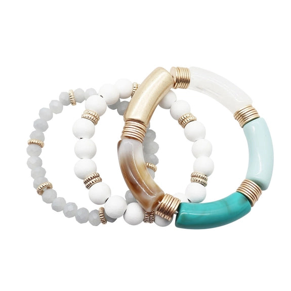 This bracelet stack will quickly become your go-to accessory, it features an eclectic mix of thin and chunky beaded bracelets with metallic accents that will perfectly pair with your favorite outfits.