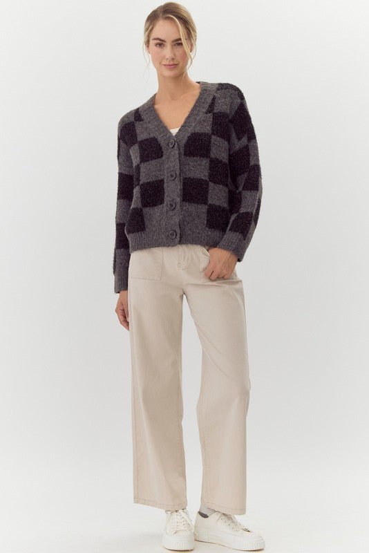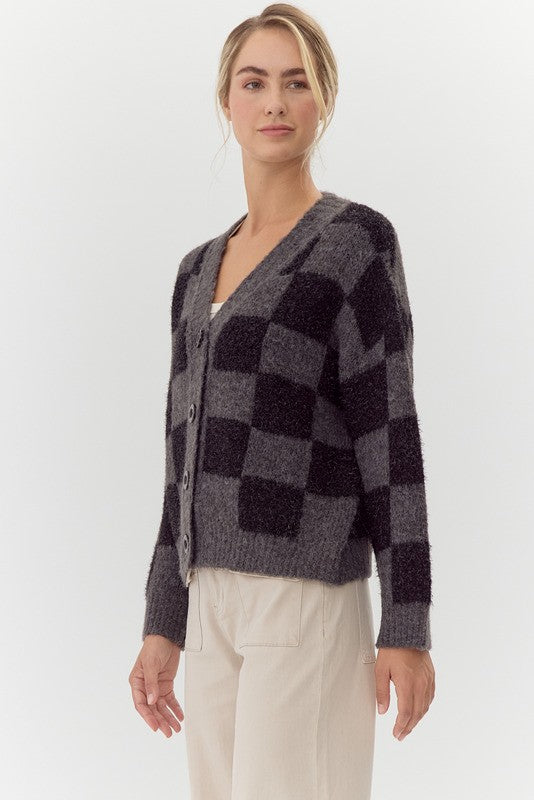 Checkered knit cardigan with V-neck, front buttoned closure, drop shoulder, long sleeves, ribbing at the sleeve ends and hemline.