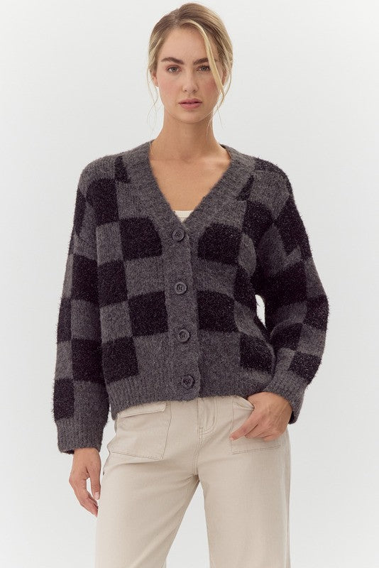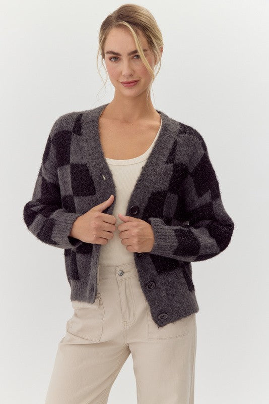 Womens Jodifl Charcoal Checkered Knit Cardigan