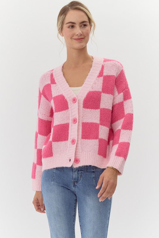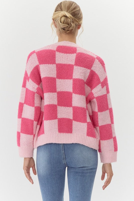 Womens Jodifl Hot Pink Checkered Knit Cardigan
