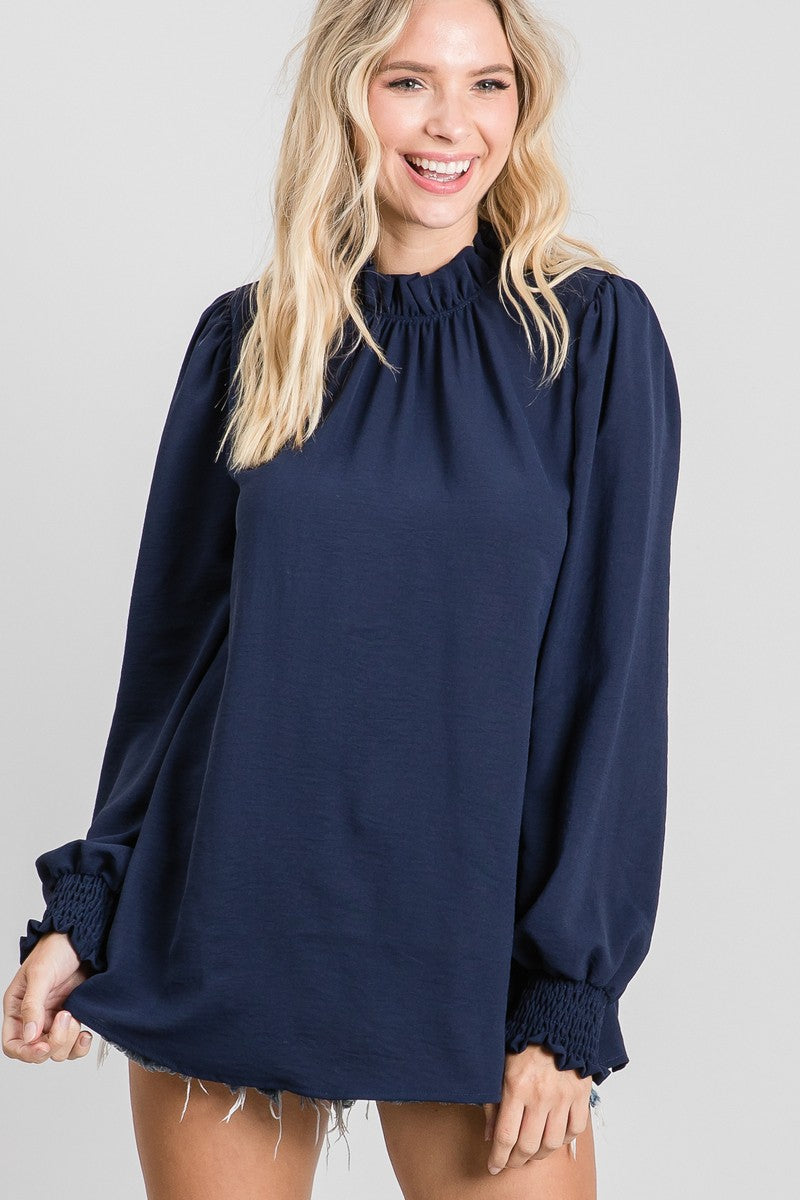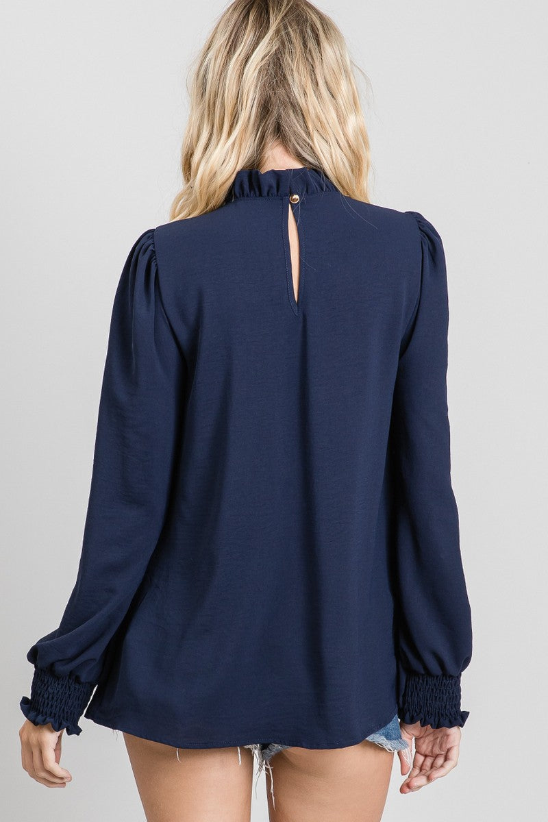 Solid top with a frill mock neckline and long bubble sleeves with smocked cuffs.
