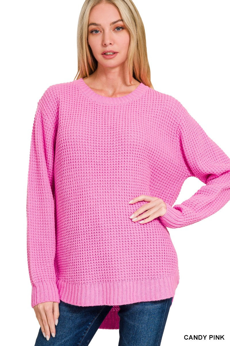Womens Zenana Candy Pink Hi-How Long Sleeve Round Neck Waffle Sweater