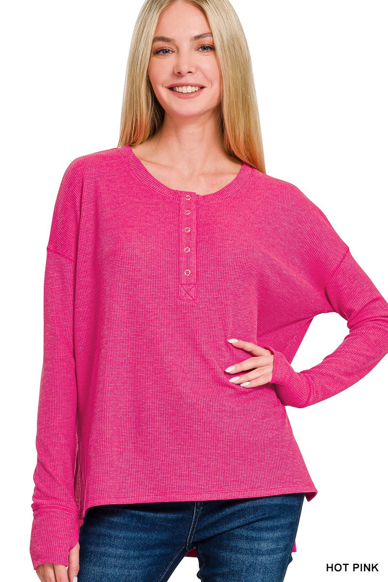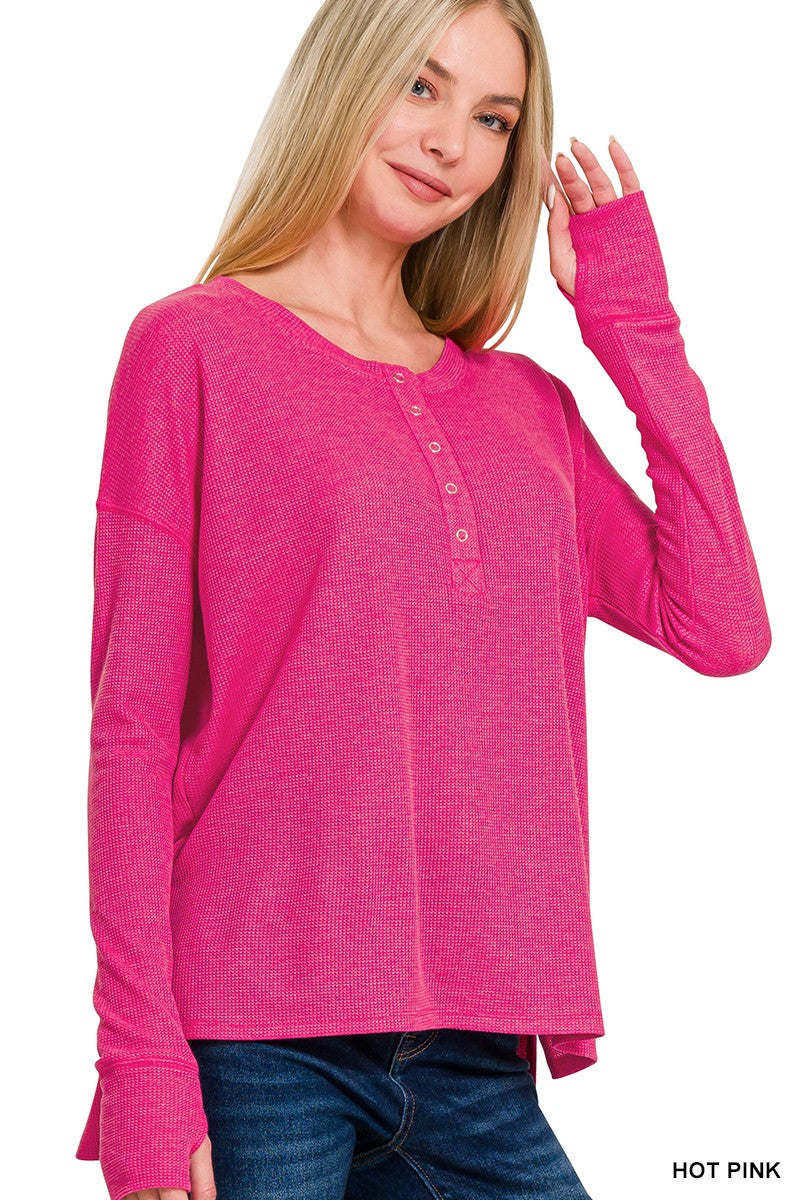 Womens Zenana Hot Pink Waffle Thumb Hole Cuffs Henley Tee